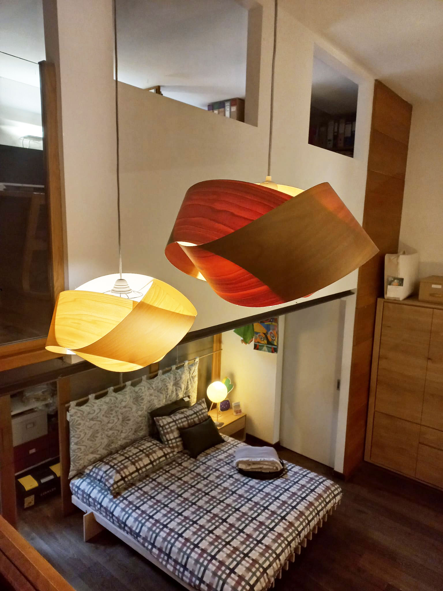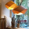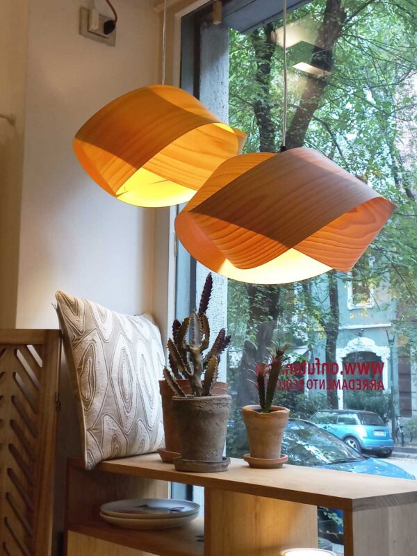 Lampada NUT LZF a sospensione realizzata con un foglio di legno, reso resistente dal trattamento Timberlite®.